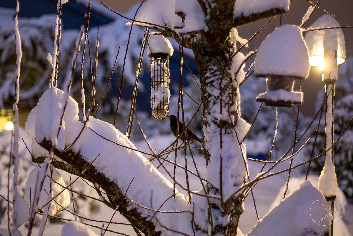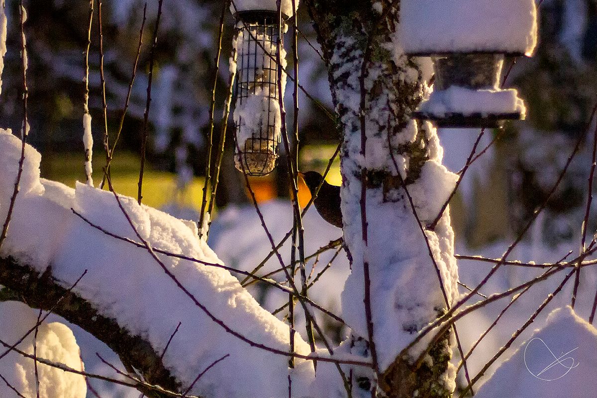 Svarttrasten var på besøk og åt frokost. Ikkje så enkelt når vi har klippt plommetreet og dei nye greinene er så tynne at dei nesten ikkje er sterke nok til fuglen. Viktig å mate fuglane når det er så mykje snø som det er no.