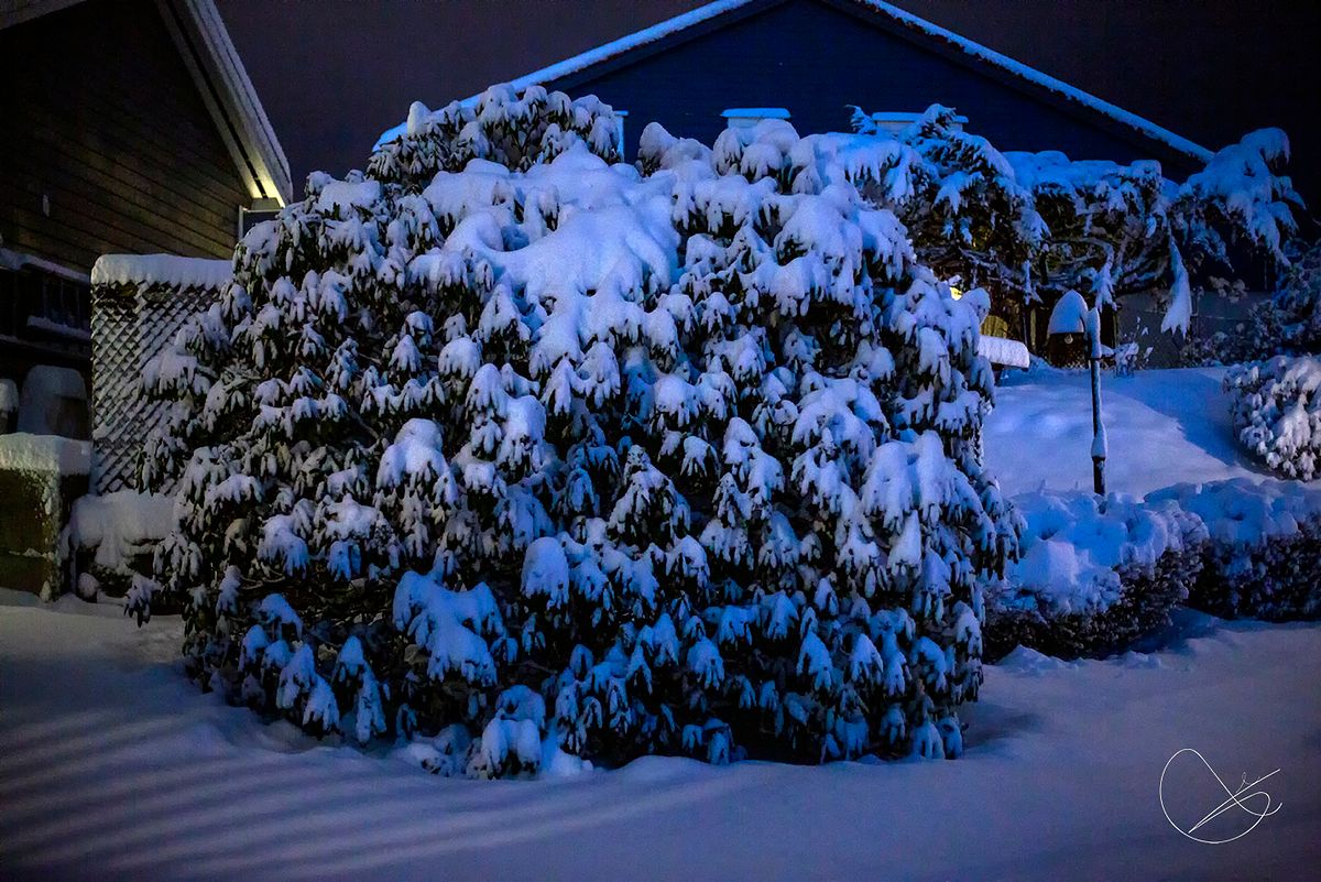Snøen låg tungt på greiner, både i buskar og tre.
